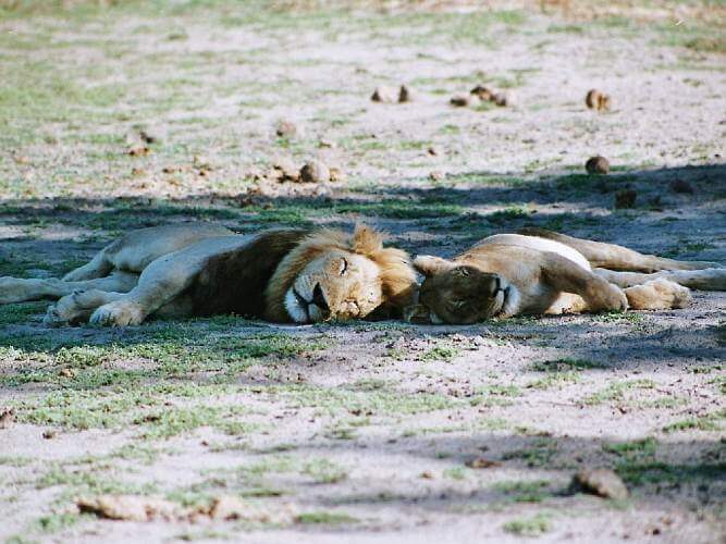 Wir irren im Sumpf umher und gelangen an einen ausgetrockneten Tümpel. Als wir am anderen Ende ankommen überfahren wir beinahe ein Löwenpärchen, das dort mitten auf dem Weg im Schatten faulenzt. Guten Morgen. Die beiden lassen sich nicht von uns stören, heben gerade mal den Kopf oder strecken eine riesige Pranken zum Gruß. Endlich erhebt sich das prächtige Männchen und lässt sich in seiner ganzen Größe bewundern. Aber was ist das? Zielstrebig schlendert er zu seinem Weibchen, das sich nun im Sand räkelt. Da sieh einer an, haben wir doch zwei Löwen beim Liebesspiel erwischt…